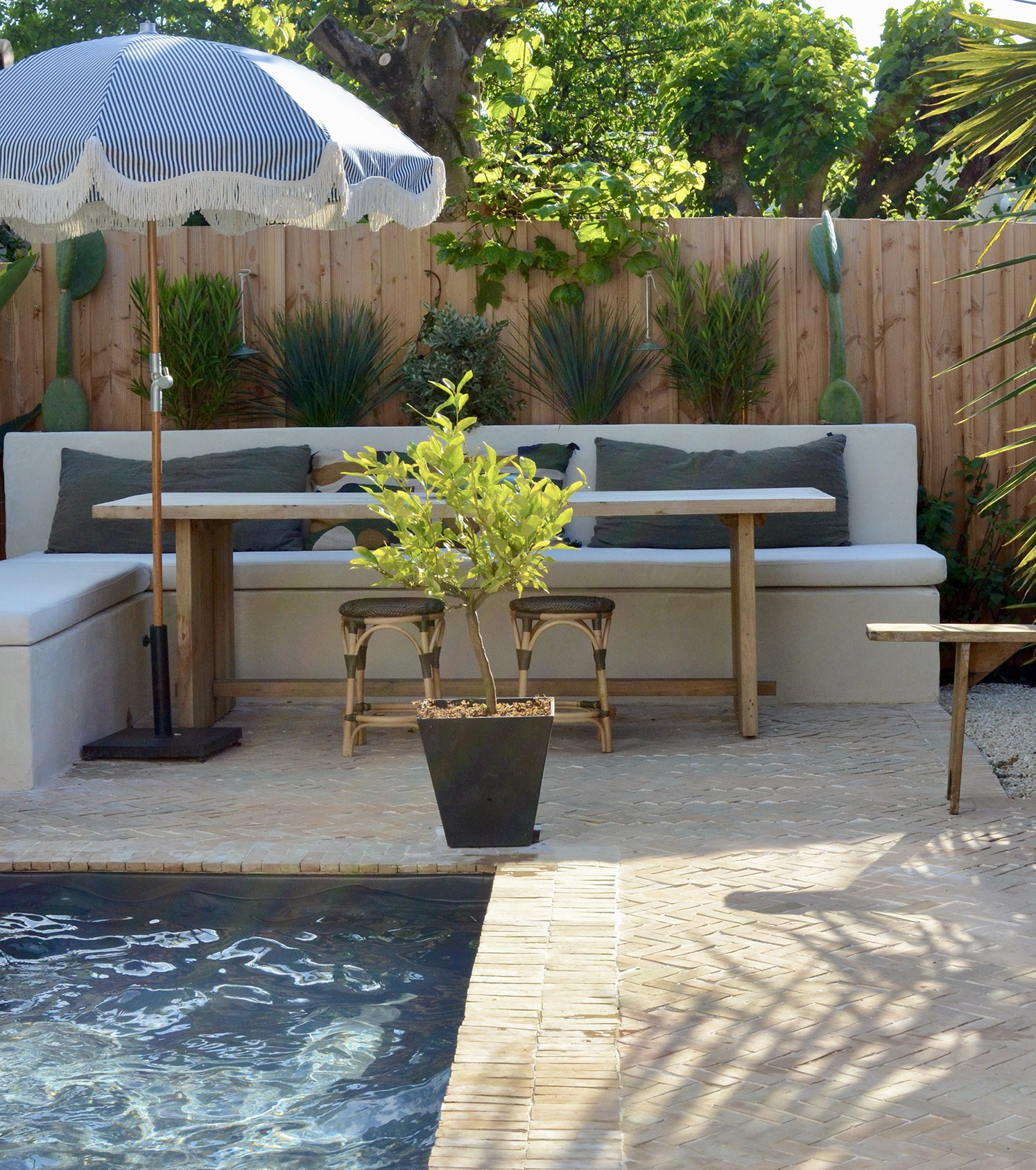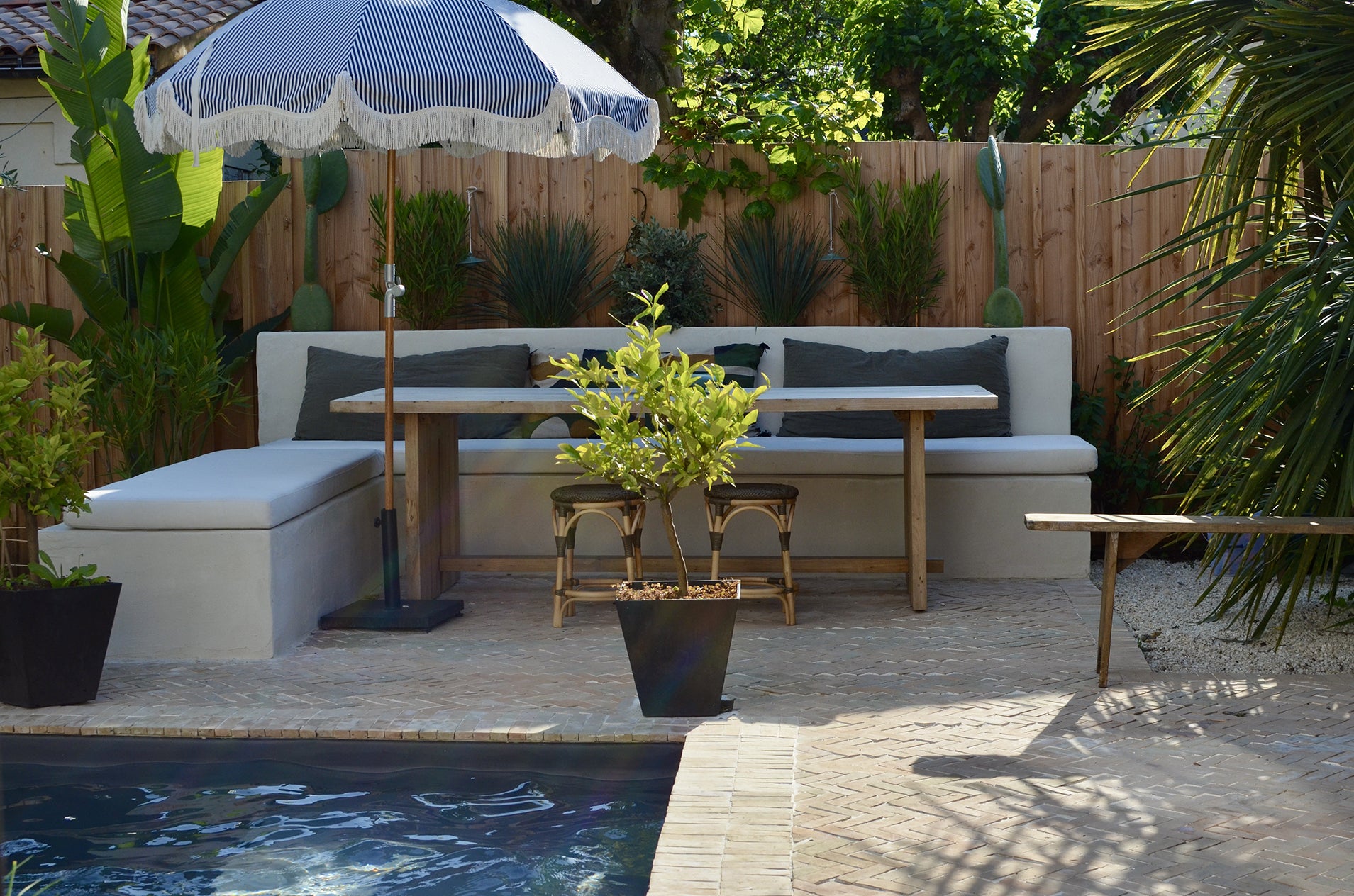 Pour créer une ambiance marocaine, nous avons choisi des plantes telles que des cactus, palmiers, lauriers et un bananier, apportant une touche d'exotisme et de chaleur à l'espace.